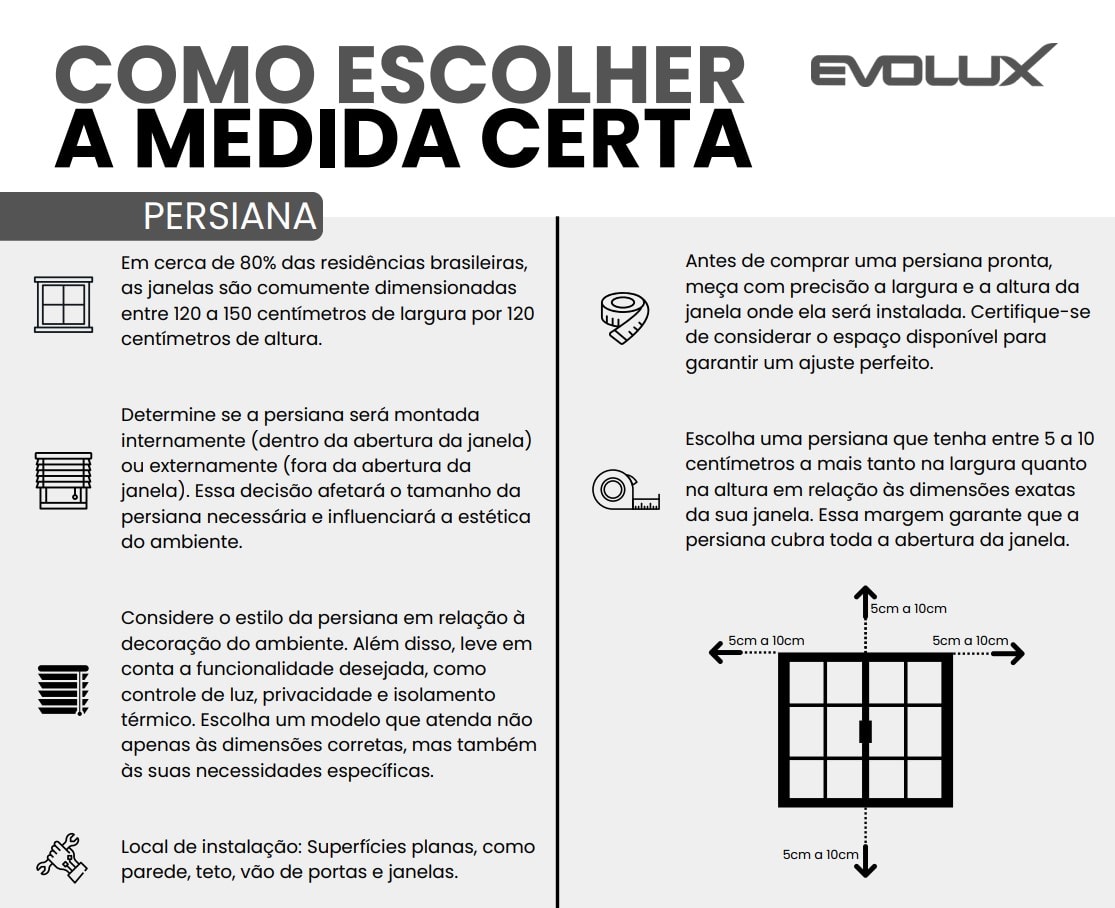A Persiana Horizontal Evolux Premier PVC Corta Luz 1,40m x 1,60m é a escolha ideal para quem busca durabilidade, controle de luz e adaptabilidade em diversos ambientes. Feita com lâminas de PVC resistente à umidade, é perfeita para quartos, salas, cozinhas, banheiros e áreas de serviço, além de ser excelente para escritórios e clínicas. Seu material contribui para bloquear o calor excessivo, garantindo conforto térmico, enquanto o design moderno e funcional proporciona controle preciso da entrada de luz.